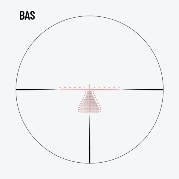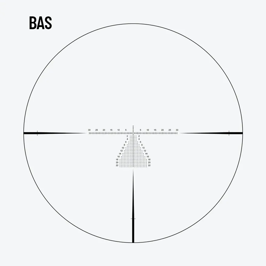 The BAS reticle is for the MOA long-range shooters, featuring a condensed christmas tree for windage that simplifies hold adjustments. This design allows shooters to quickly and accurately compensate for wind, enhancing precision and confidence at extended distances.
