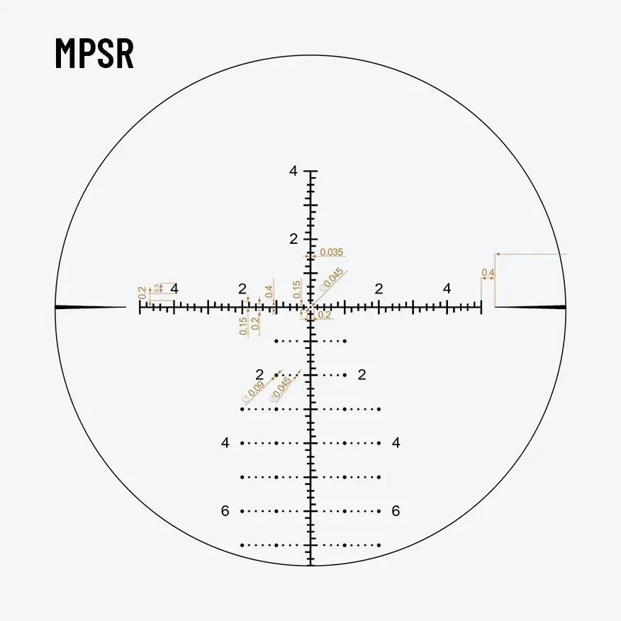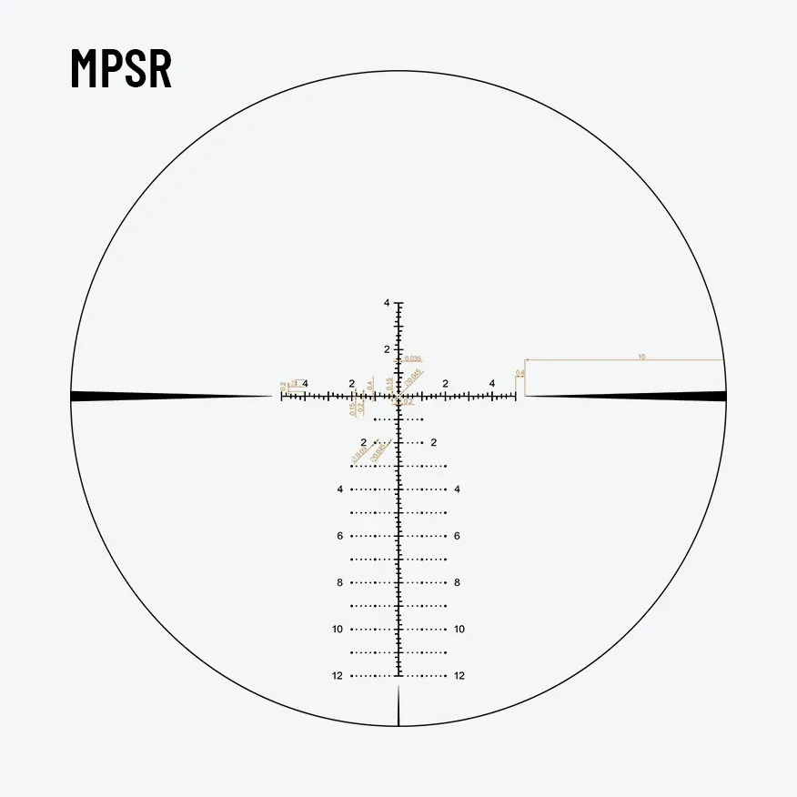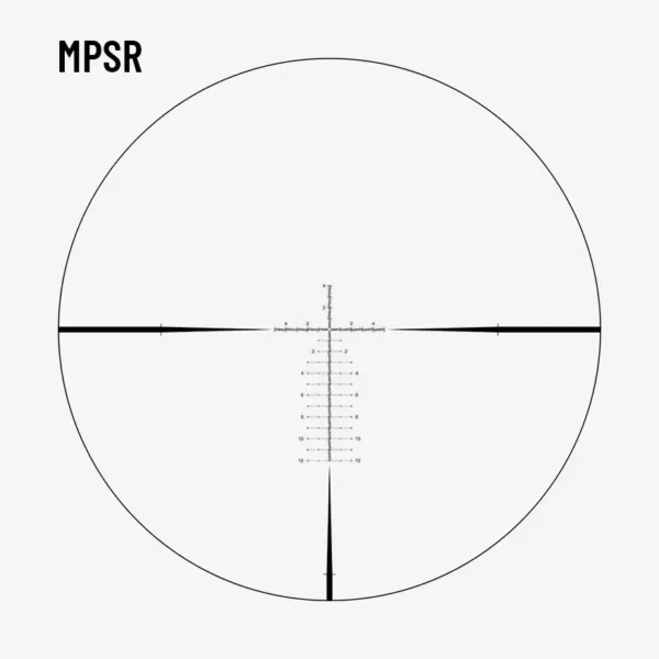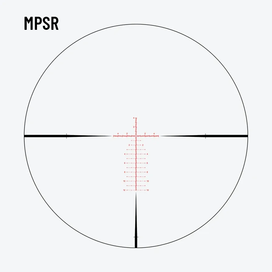 The MPSR reticle is designed for precision long-range shooting, offering clear windage and elevation markings. With finely spaced MIL hash marks and holdover points, it allows shooters to make accurate adjustments, ensuring confidence and accuracy at any distance.
