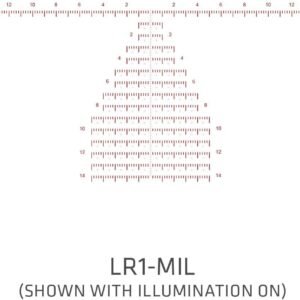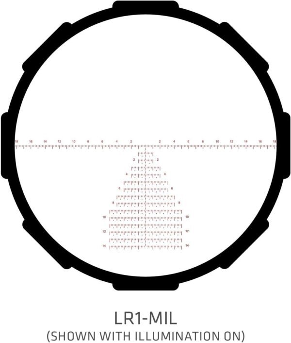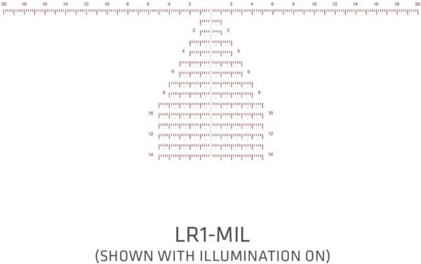 • FIRST FOCAL PLANE (FFP): Glass Etched, LR1-MIL Advanced Illuminated Reticle sits in front of the magnification mechanism, scaling to provide correct Ballistic hold points at any range.
