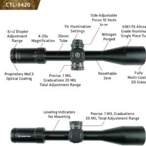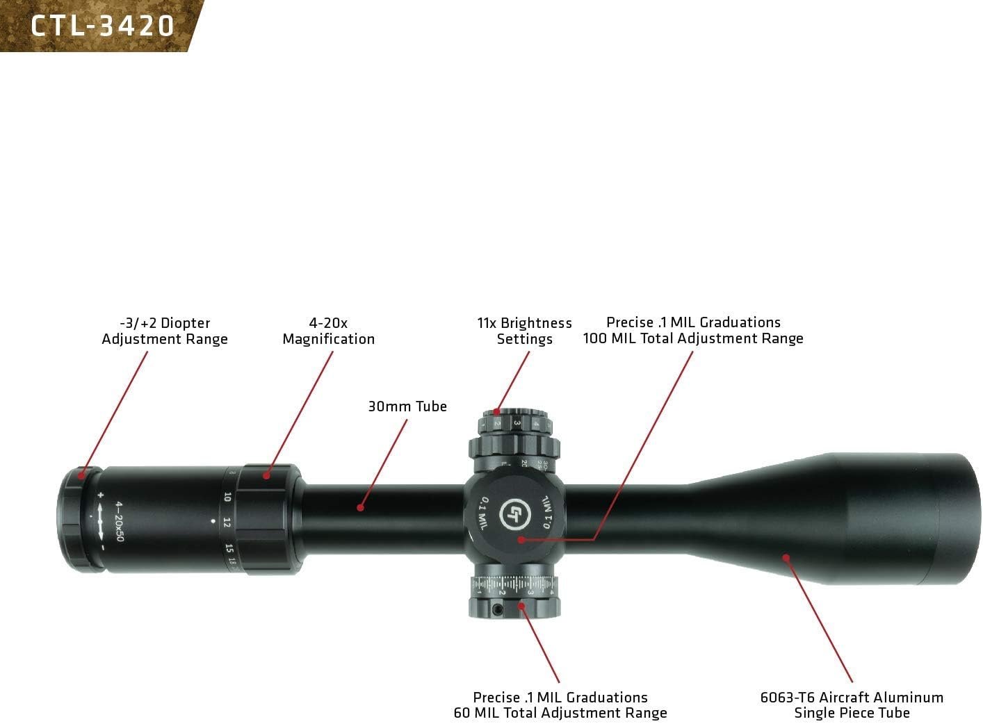 The CTL-3420 3 Series is a feature rich 4-20x50mm mid-range rifle scope that has been purposefully built from the ground up. The scopes First Focal Plane (FFP) and impressive Japanese ED Glass clarity makes for an unparalleled shooting experience. The custom designed LR1-MIL advanced reticle is fully illuminated and offers quick hold-over points for wind age and elevation. The exposed . 1 MIL tactical turrets provide a precise and rugged feel when dialing for the most accurate of shots. The entire Crimson Trace scope line offers EZ mount leveling indicators for quick and exact mounting and rare tech (Red alignment ring) for proper eye placement. All Crimson Trace Scopes are covered under a Full Lifetime Warranty.